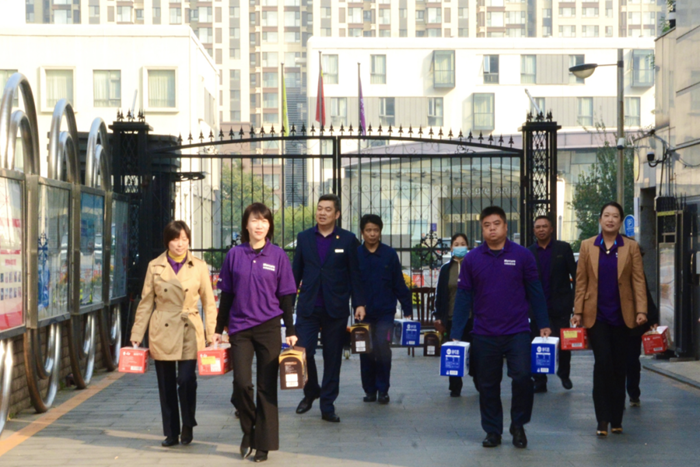 華騰美居酒店業(yè)主代表趙麗霞帶領(lǐng)管理團隊走進大望社區(qū),為老人們送上牛奶、燕麥、面條等慰問品,將濃濃的關(guān)愛和重陽節(jié)的祝福送到老人面前。