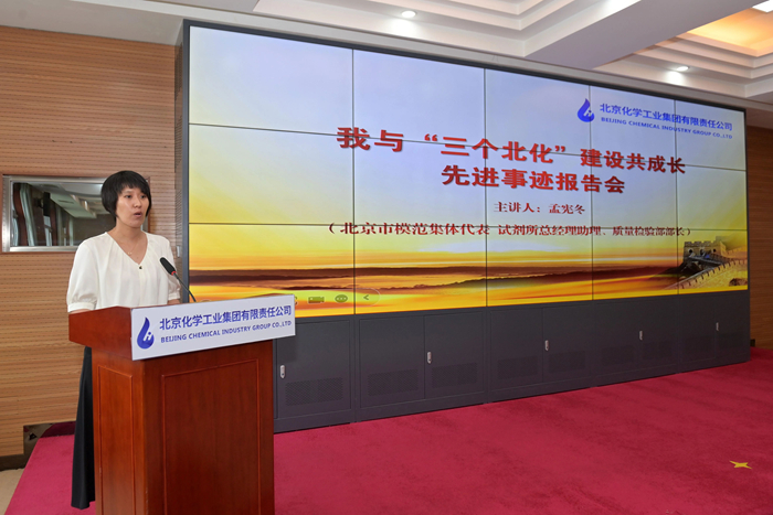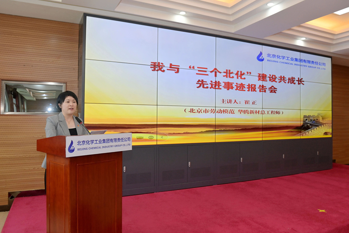 在先進事跡報告環(huán)節(jié),市勞動模范,華騰新材總工程師崔正攜《以使命為船,以熱愛為帆,在時代洪流中奮勇爭先》;市模范集體代表,試劑所總經(jīng)理助理、質(zhì)量檢驗部部長孟憲冬以《傳承工匠精神,助力“三個北化”,試劑所質(zhì)量檢驗部的奮進之路》為題,圍繞個人成長、科研開發(fā)、團隊建設(shè),自信講述與北京化工共同成長的點點滴滴。