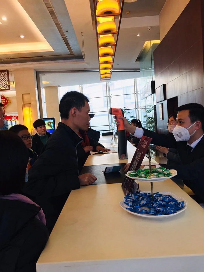 酒店對(duì)公共區(qū)域每一小時(shí)進(jìn)行全面消毒并做好記錄,提高消毒消殺頻次,加大對(duì)客房區(qū)域消毒通風(fēng)力度;同時(shí)在酒店大堂進(jìn)出口設(shè)置賓客體溫檢測(cè)點(diǎn)。