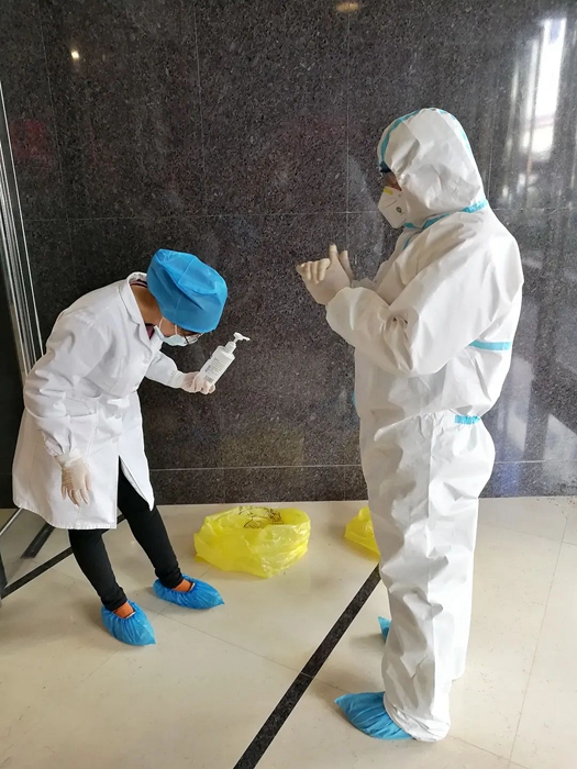 “我是黨員,我先來”,時間緊任務(wù)急,作為一名黨員率先垂范,周麗麗勇敢地接下送餐和垃圾收納任務(wù)。為確保完成一日三次的送餐和垃圾收納工作,周麗麗每次都要全副武裝穿上防護服,并嚴格按照要求進行消殺。俗話說隔行如隔山,從未接觸過防護服,其穿脫過程異常艱難,但周麗麗不怕麻煩。為了防止交叉感染,隔離區(qū)域的電梯停止使用,每次賓館人員送餐都要爬樓梯將餐飲搬到樓梯間,然后由全副武裝的周麗麗徒步一個房間一個房間地配送。送餐完畢,還要一個房間一個房間地收納垃圾。由于防護服不透氣,剛一行動起來,周麗麗已經(jīng)渾身是汗,但是她沒有退縮,每次都保質(zhì)保量按時完成了任務(wù)。在數(shù)日的時間里多次進入隔離區(qū),圓滿地完成了任務(wù),真正做到了關(guān)鍵時刻站得出來,危急時刻豁得出來。