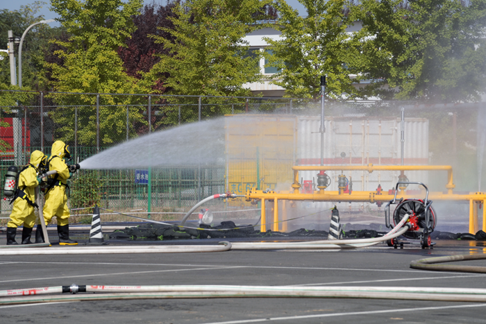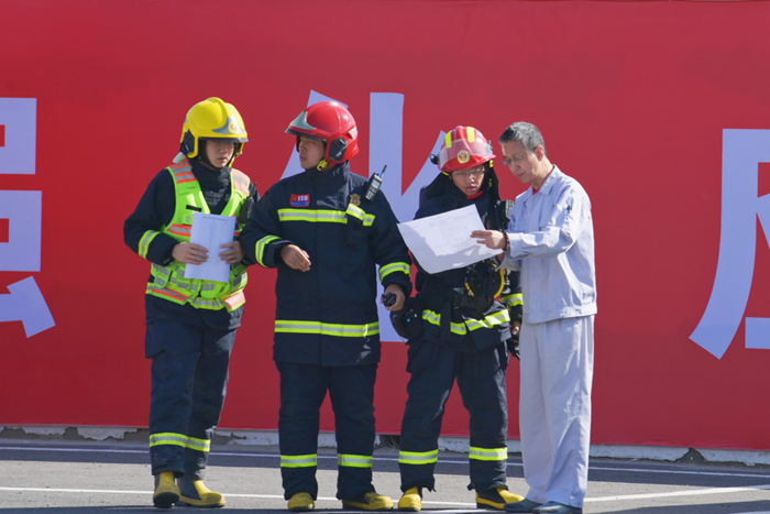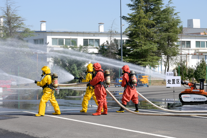 演練緊張而有序,周邊有毒有害氣體濃度監(jiān)測(cè)和偵檢、事故現(xiàn)場(chǎng)火災(zāi)撲救、空氣中可燃?xì)怏w和有毒有害氣體濃度稀釋、泄漏危險(xiǎn)化學(xué)品輸送管道堵漏……環(huán)環(huán)相扣、環(huán)環(huán)跟進(jìn)。