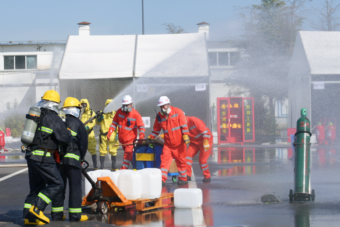 本次演練以華騰化工危險(xiǎn)化學(xué)品儲(chǔ)存庫(kù)房?jī)?chǔ)存的丙酮起火,引發(fā)了一系列的衍生事故,導(dǎo)致事故逐漸升級(jí)為背景,選取危險(xiǎn)化學(xué)品倉(cāng)庫(kù)事故典型場(chǎng)景作為本次演練主要科目。