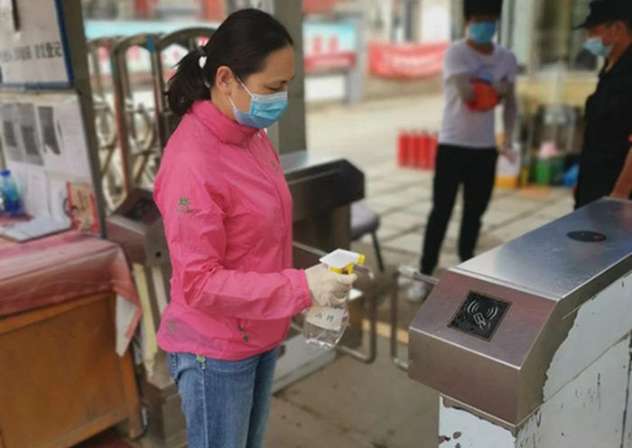 集團總部 時建秀 在工作區(qū)域噴灑酒精進(jìn)行崗前消毒
