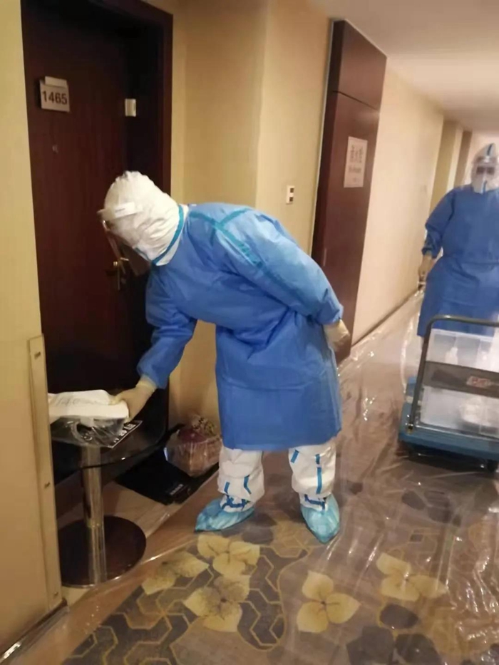 此次接待任務(wù)的變化,隔離區(qū)14名服務(wù)人員每天都要多次穿脫防護(hù)服,一天下來(lái)至少需要更換5次防護(hù)服。由于防護(hù)服不透氣,還特別悶,剛一行動(dòng)起來(lái),他們已經(jīng)渾身是汗,護(hù)目鏡上就會(huì)起一層水霧,迷糊了雙眼,但他們每次都保質(zhì)保量按時(shí)完成任務(wù),14名隔離區(qū)的骨干成員,以自己的堅(jiān)守展現(xiàn)著自己的價(jià)值。難怪有人說(shuō):“最辛苦的是始終奮戰(zhàn)在一線的員工們,尤其是隔離區(qū)每天身穿防護(hù)服的大白們。任務(wù)承接時(shí)期,大白一穿就是14天!”