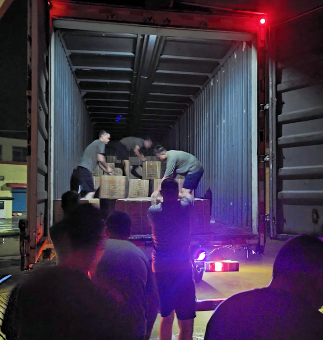 命令如山,華騰化工倉(cāng)儲(chǔ)管理部共產(chǎn)黨員朱雨、劉寶玉、張?jiān)骆昧⒓绰?lián)合公司值守人員安全保衛(wèi)部共產(chǎn)黨員劉兵、隋紅賓緊急集合,冒雨備貨裝車(chē)。僅用時(shí)4小時(shí)就完成全部物資的裝車(chē)。