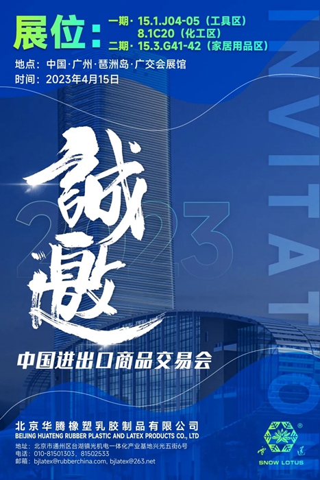 華騰橡塑繼4月15日至19日在工具區(qū)、化工區(qū)參加第一期廣交會(huì)后,于4月23日至27日將在第二期家居用品區(qū)設(shè)有展位。在此恭候您的到來(lái)。
